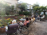 今日も、気持ちの良いお天気でしたので、夕食前に中庭で日光浴?外気浴をしました。「花壇のお花が元気になったね」と話されながら、短い時間でしたが、ご入居者様が楽しまれていました。