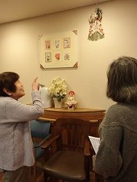 昨日まで、サンタさんがピカピカしていたところに、羽子板や先日、入居者様と一緒に作成したフラワーアレンジを飾らせて頂きました。