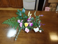 今日は、いつもの介護予防体操がフラワーアレンジ教室に代わって開催しました。始めは、オアシスを前に固まっていましたが、1人が花を挿したら、次々に始められました。