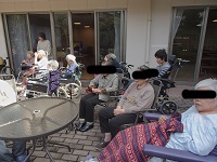 しばらくぶりの青空でスタッフから入居者様を日光浴してもらいたいと声掛けし、入居者様が、昼食前の時間で中庭にて日光浴となりました。