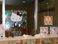2018年までのキティを飾った廊下にスタッフが作ったキティ3枚を施設長が抱えて
