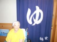 そんな中、1番湯に呼ばれた方をパシャリ。「やめて、恥ずかしいじゃない」、「さようなら」と言われ手を振られてしまいましたので、その後は、入浴する前に浴槽の前でと、入り口の暖簾と一緒に写真を撮らさせて頂きました。