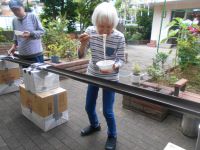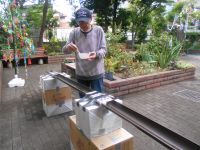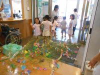 ゼリーを召し上がっていただく方々には、あおぞら保育園の園児が持って来て下さった、七夕の笹竹飾りの下にテーブルを出して召し上がっていただきましたが、天気が良すぎて「暑い」「せっかくのゼリーが解けちゃう」と急いで召し上がられていました。