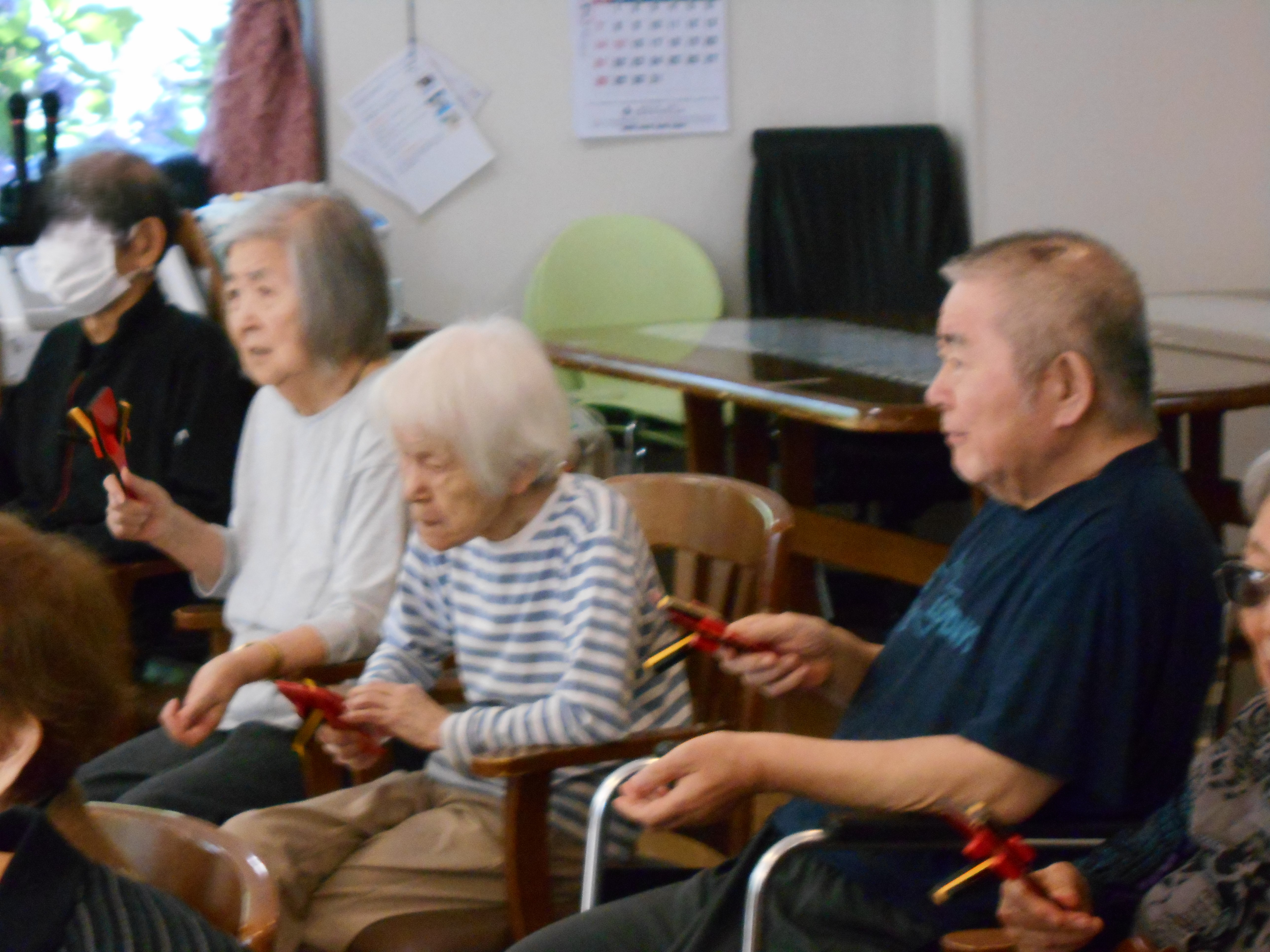 一番使っているのは鳴子ですが、良い音を出すのにはきちんと振らないといけないのですが、歌をうたいながら無意識に動かしてくださるので、手と腕のいい運動になります。
