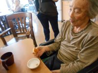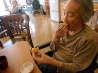 おやつを食べているところとおもいフロアに伺うとおやつのお菓子はすでに食べ終わってお茶やコーヒーを飲み干すところでした。