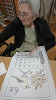 カレンダーの色塗り 色の重ね塗りで『メジロ』を塗られ皆さんから『すごい上手』と絶賛されていました。(*^O^*)