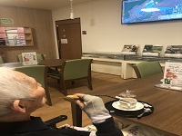 こんにちは、グリーンライフ津山元魚町です。本日、千葉県松戸市の施設シーハーツ松戸より、全国68施設に向けてお花見ライブが配信されました。グリーンライフ津山元魚町でも一足早いお花見を各食堂でしていただきました。「わあ、桜が咲いてるねえ。」と喜んで鑑賞いただきました。その後の昼食でお花見弁当を召し上がっていただきました。津山の開花はもう少しかかりそうです。