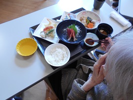 お刺身・天婦羅・煮物・赤だし・デザートを昼食レクで頂きました。
