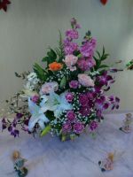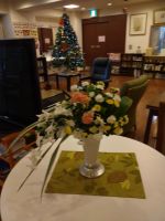 カサブランカ、デンファレ、カーネーション、ストックと豪華にまとまっています。ワイン系のお花が目立ちクリスマスの飾りとマッチしています。前回のお花もまだ元気なので館内に飾りました❀