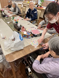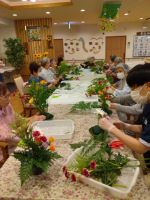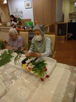一本の枝に沢山のお花がついているので小分けにして挿すとボリュームが出て豪華になりました。機能訓練指導員が見本を作ってくれて皆様も参考にしていました。今日も素敵なアレンジメントが完成しました((´∀`*))