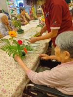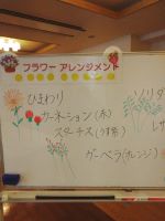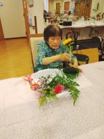 今回も機能訓練指導員が上手にお花の絵と名前をホワイトボードに描いてくれてお花を確認しながら一生懸命に活けていました。それぞれに素敵なアレンジメントが完成してお部屋に飾り、お部屋も華やかになりました(^▼^♪)