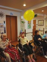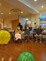 今日、101歳のお誕生日を迎えられたO様も参加!皆様から「おめでとう」の言葉をいただき喜ばれていました。他の方々も長寿を目指してパワー全開で楽しまれていました。四つの風船が次から次へと飛んで来て手と頭で同時に受けたりと今日も大笑い((´∀`*))でした。