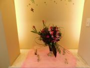 バラ🌹の花がメインで「バレンタインデー」をイメージされた作品でとても素敵です。💕ハート型にするのが大変だったそうです。ご家族様も「素敵ね、葉を曲げたりして細工できるのはやはりプロね」とじっくりと眺めていました。