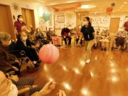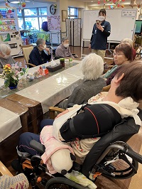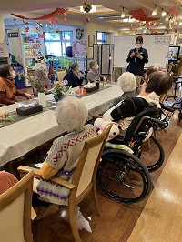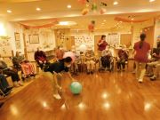一つの風船をパンパンにして割れるように細工をしたのですが( ´艸`)割れません!毎回、白熱した風船バレーでスタッフも汗💦をかきながら奮闘していました。最後、水分補給時に何人かの方が「今日は割れなかったわね」と・・・それならと施設長が風船に座って「ぱぁ~ん」と割りました。細身でも血(尻)圧は凄いんです。今日も大盛り上がりの風船バレーでした。