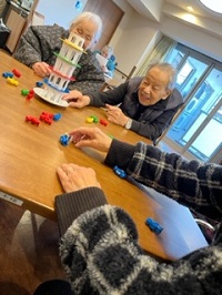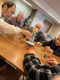 1階はオセロや将棋を楽しまれ、2階はトランプ♣、3階はぐらぐらゲーム、4階はスタッフが考えたゲームでマジックテープのついた手袋でふわふわボール(大、小)をいくつつける事ができるかで点数を競います。各フロワー皆様、仲良く楽しまれていました。今まであまり参加されていなかった方もフロワーレクになってから毎回参加されています。理由はあまり沢山の中よりは顔見知りの方達の中の方が良いとか・・・楽しみ方も人それぞれですが多くの方に楽しんでいただけるのが何よりです( ”▼”)/