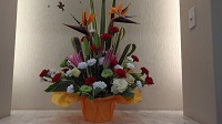 花屋さんにお願いしたら、この時期らしいカーネーションをメインに据えた立派なアレンジメントが届いたので、早速飾らせて頂きました(^^)