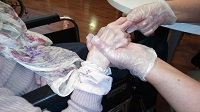 各フロアの遅番スタッフが、ご入居所様のお手を拝借し、クリームを使ってゆっくりとマッサージ。