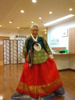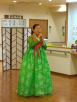 衣装も豪華で扇子や髪飾り、装飾品も持ってきてくださり実際に手に触れて楽しむ事もできました。ご入居者様も韓国衣装を着せていただきお姫様気分を味わえたようです。途中、歌も披露してくださり韓国の文化を感じる事ができました。