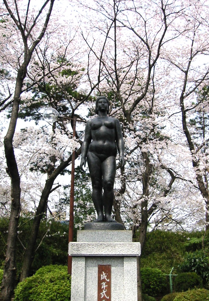 蕨城址公園内には「成年式発祥の地記念象」が建立されています。