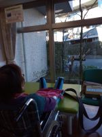 リハビリコーナーで外を眺めながらメドマーを実施されているご入居者様!とても気持ち良さそうです。「此処だと色々な人が通るのが見れて目の保養になり楽しいわ」と仰っていました。