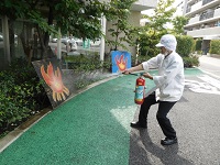 厨房から火が出たとの想定です。ご入居者様にも協力して頂き、介護スタッフ・厨房スタッフ皆参加で実践的な内容で実施。