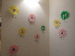ピンク、黄色、緑の花の中にスタッフの顔写真が張ってあります。