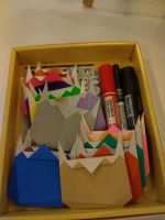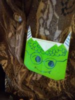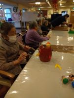 機能訓練指導員が鬼👹の折り紙を折ってくれてリハビリ後に顔を描いてもらっています。