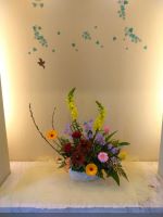 春らしい感じの素敵なアレンジメントです。お正月用のお花もまだ元気だったので先生が松を抜いてアレンジしてくれました。まだまだ楽しめそうです。