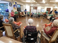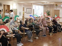 「月が出た出た~月が出た~」の炭坑節の音頭に合わせて皆様扇子を使って身体を動かす独特のエクササイズです。上半身だけの動きなのですが、結構いい運動になり、終わった後うっすら汗をうかべる入居者様もいらっしゃいます。