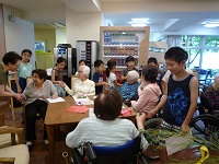 入居者様と笹に飾りつけし、短冊に願い事を書いてお祝いする…だけではなく、今日は何と!親子ボランティアさんに来て頂き、子供さんと入居者様と一緒になってお祝いしました♪