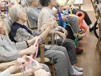 いつも3B体操でお世話になっている宮嵜先生のご指導のもと、座ったまま音楽に合わせてゴムやベルダー、ベルを使ったエクササイズが行われました。