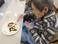 パンケーキを焼く係り、トッピング係りといろいろチャレンジしている入居者様の姿は、