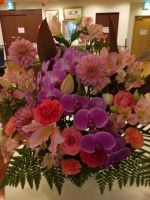 息子様、お孫様、ひ孫ちゃんと沢山の方々がお祝いに来られ一緒に食事をされ楽しい時間を過ごされました!お孫様からは豪華なお花が届き感動していました。お部屋には大きいので皆が見える場所に飾ってという事で1階のフロワに飾らせてただきました。機能訓練指導員がメッセージのボードを作ってくれてお風呂に行かれる方々も「綺麗ね」「立派なお花」と眺めています。