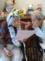 102歳のお誕生を迎えられたO様の元にカメラ📸は直撃!メッセージカードを喜んでくださました。一緒にお祝いされていたT様は優しくメッセージカードをO様に読んでくださいました。同じフロアで今年101歳になられる方が二人いらっしゃり、三人で304歳です。周りの方々の反応が凄く「万歳」と拍手喝采です。皆で一緒に🍰を食べて、また、思い出が増えました。
