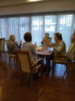 今日は午前中に2名の傾聴ボランティアの方が来てくれて、楽しく会話されていました。定期的に来てくださっていて、ご入居者様も打ち解けています。何よりも笑うのが一番とボランティアの方も言われています。でも笑い( ´艸`)だけでなく、悩みも聞いてくださいます。コロナ過で中止していましたが再開できて何よりです。
