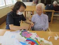 もうお一人の大正淑女(^^♪ 中々手先が器用でございまして普段は広告紙で箱を折って下さったりするのですが、今回は梅雨をイメージした壁飾りを裁断して下さいました♪ もちろん昭和ギャルも手伝って下さいましたよ(^^♪
