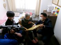 別府市長、新聞社・ケーブルテレビの方が百歳のお祝いの為、表敬訪問。