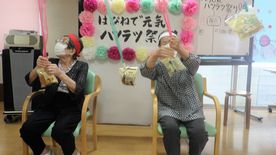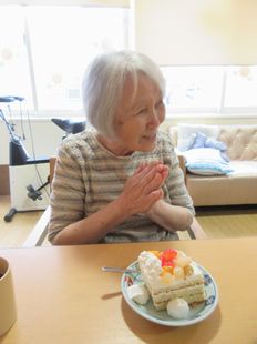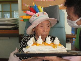 スタッフお手製の誕生日ケーキを前に記念撮影。
