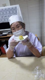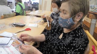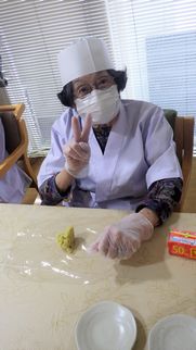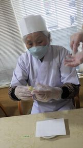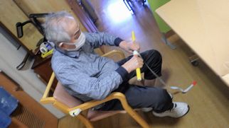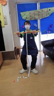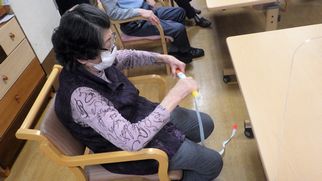 腕の筋肉を使って棒についた紐を巻いていきます。
