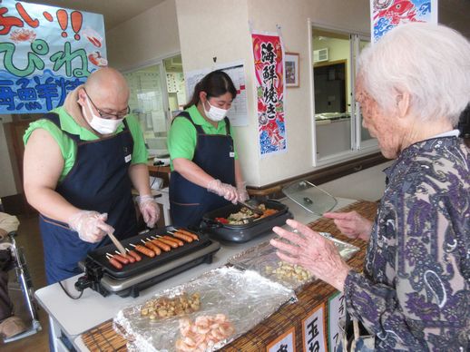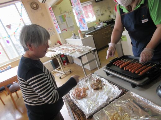 利用者様の目の前で、野菜類やフランクフルト等を焼き、