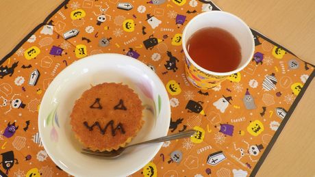 おやつはハロウィーンに因んでカボチャのマドレーヌにチョコペンでデコレーション