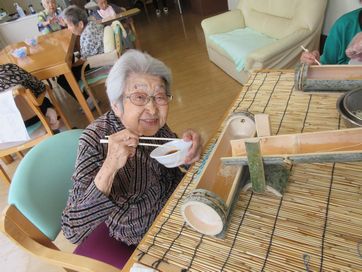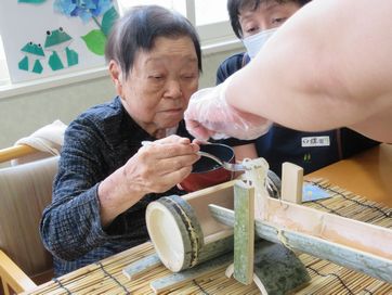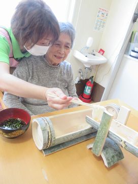 グループホーム2階・3階でそれぞれ別の日に流しそうめんレクを実施致しました!