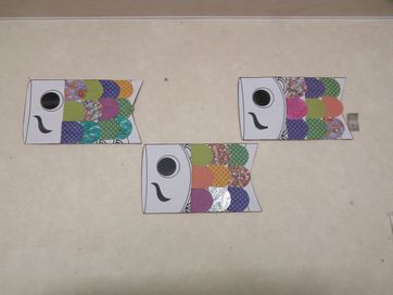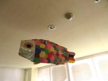 手作りの鯉のぼりを模した飾りを壁に貼り付けたり、大きい物は天井から吊るしてみたり・・・