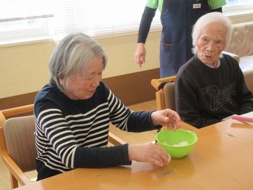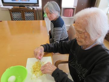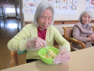 ゆで卵の殻剥きから、細かく刻んで頂く・マヨネーズと混ぜる作業をそれぞれ他の利用者様に行って頂き、「楽しみ」と反応も上々。