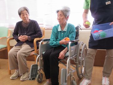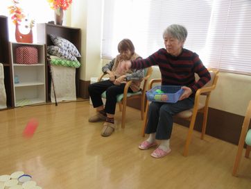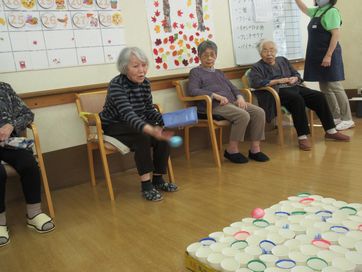 皆さん懸命にボールを投げられ、中には一度床に当ててバウンドさせたり、高く上げて勢いよくコップに入れたりなど工夫される方もいらっしゃいました。