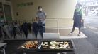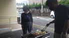 入口横の、普段は送迎車が駐車しているスペースを用いて行い、上がる煙と肉や野菜の焼ける匂いに「すごいな」「いい匂い」と皆様興味津々なご様子でした。