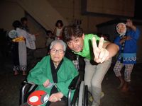 大きな太鼓の音に驚かれる方もいらっしゃいましたが、馴染みのある曲や着物姿で輪になって踊る人に、皆様笑顔で拍手や手拍子をされたりと喜ばれていました。