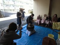 その後はデイサービスの駐車場を用いて、もはや恒例となりました餅つき! 回数を分けて行い、グループホームのフロア別に全ての利用者様と御家族様とで、昔ながらの餅つきの様子を鑑賞し楽しんで頂きました。男性の方には何名か手をお借りし、一緒に餅をついて頂いたりも。勢いよく餅をつく度に「よいしょ!」と周りの方からも自然と歓声が上がり、大盛り上がりでした。つきあがったお餅は昼食時に餡やきな粉等で美味しく頂いた他、別に丸めたお餅は御参加頂いた御家族様にお土産としてお持ち帰り頂きました。