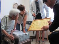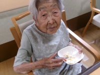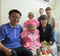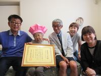 百寿のお祝いにご家族が来て下さいました♪ そして市役所からお祝いの記念品を持って来て下さってとっても忙しい嬉しい一日となりました♬ 百=もも にちなんで桃色のちゃんちゃんこがとってもお似合いです♪ まだまだ長生きして下さいね(^^♪