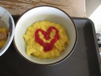 本日の朝食はふわトロスクランブルエッグ🍳 ケチャップで♡のマークを書きました( *´艸`) 「ありがとう(≧▽≦)」「